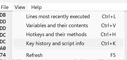 をエディタに埋め込み実行するか、タスクバーのAutoHotkeyをダブルクリックして【View】→【key history and script info】を選択します。