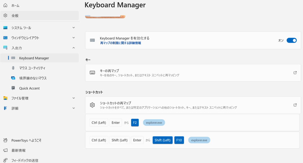 PowerToysのインストールしたら、Keyboard Managerを有効にして、【ショートカットの再リマップ】を選択します。