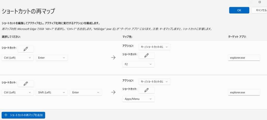 例だと、エクスプローラー上でCtrl(Left) + Enterを押すとF2がリマップされます。