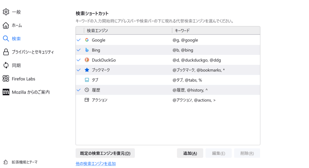 Firefoxで検索ショートカットを追加したい場合【設定】から追加することが可能です。about:preferences#search