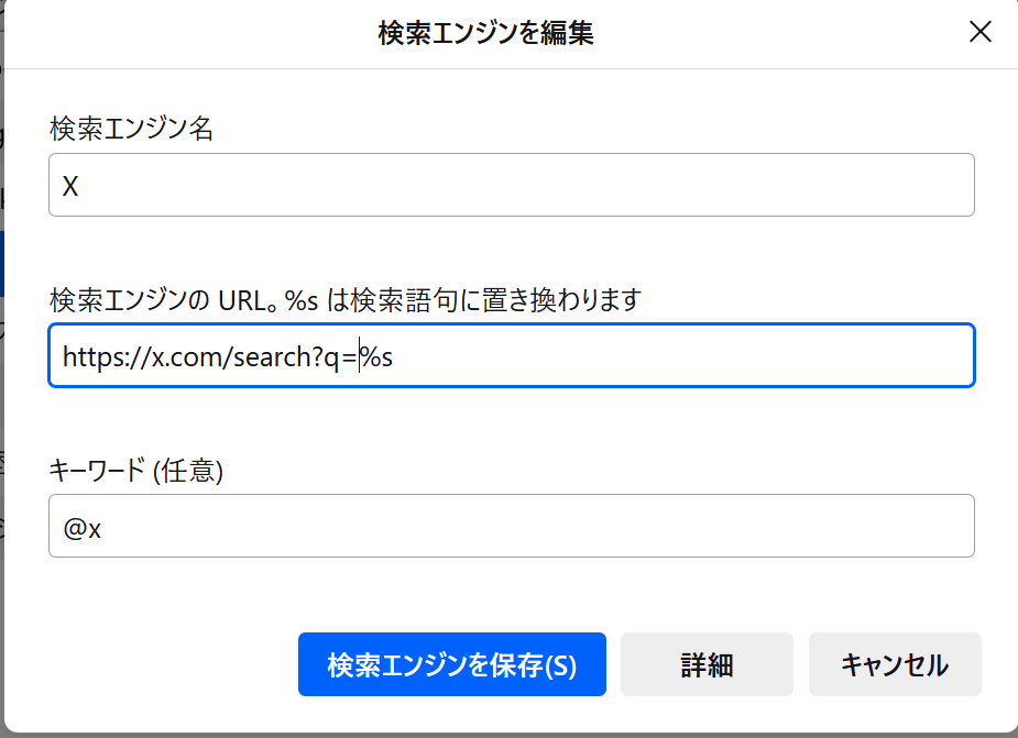 がXの検索エンジンとなり、それ以降のテキストを検索語句にしたいためhttps://x.com/search?q=%s