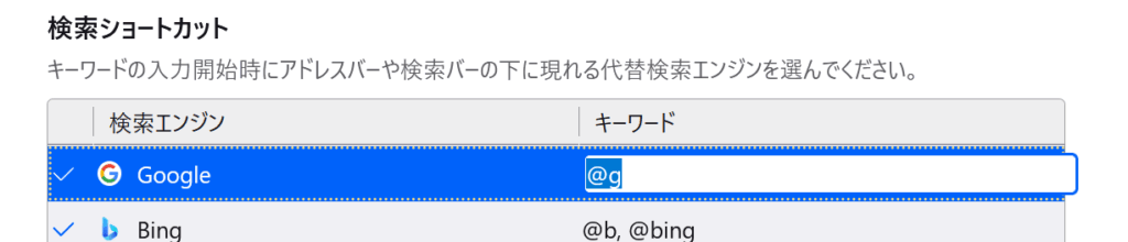 もし既存の検索エンジンのショートカットキーワードを変更したい場合ダブルクリックをすることで追加することが可能です。