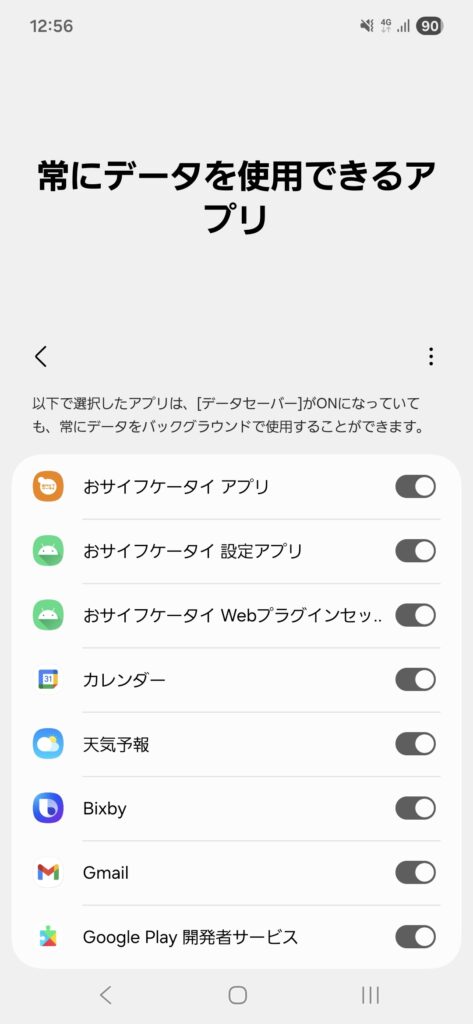 常にデータを使用できるアプリで有効になっているアプリがモバイル通信中でも常に通信ができるようになります。
