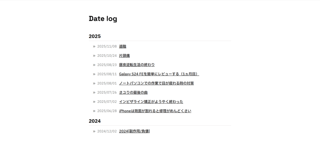 上記のコードをindex.phpまたはarchive.phpなどの記事一覧ページに記述します。get_the_date()で今年の年数を取得して現在ループされている記事の年数と一致しているかを調べています。もし不一致であればループを抜け出し去年の記事一覧を出力します。